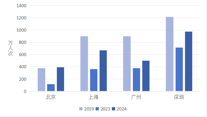市场基数较小的部分城市恢复速度相对更快。2024年张家界和杭州的入境游客接待量均已超过疫前水平。较小的市场基数很大程度上拉高了恢复水平。2019年,张家界和杭州的入境游客接待量均较低,分别为137万和113万人次(过夜数据)。相比之下,重庆、成都、西安、桂林等2019年市场基数较高的城市,恢复水平相对较低。